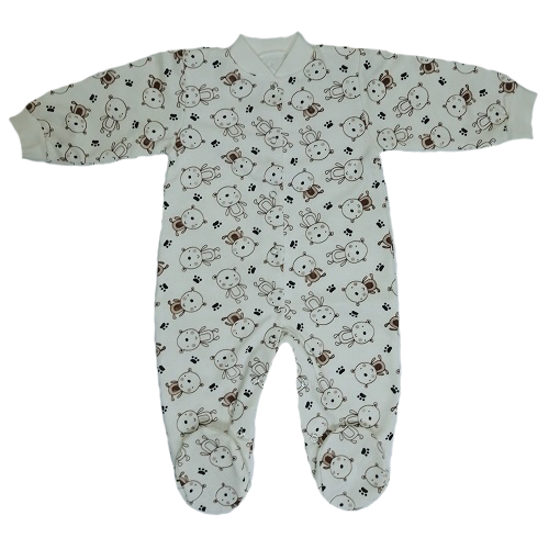 Комбинезон с воротником стоечкой, спереди на кнопочках, с закрытыми ножками, рукавчики на манжете.