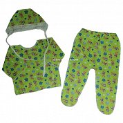 Комплект состоит из распашонки с рукавчиками трансформерами и с кнопочкой на одной стороне, ползунков на резинке, чепчика. Все швы у набора выполнены наружу. Расцветки в каждой партии отличаются.