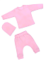 Комплект состоит из кофточки с длинным рукавом, с кнопочками на одном плече и штанишек сверху на широкой резинке, снизу на манжетах.